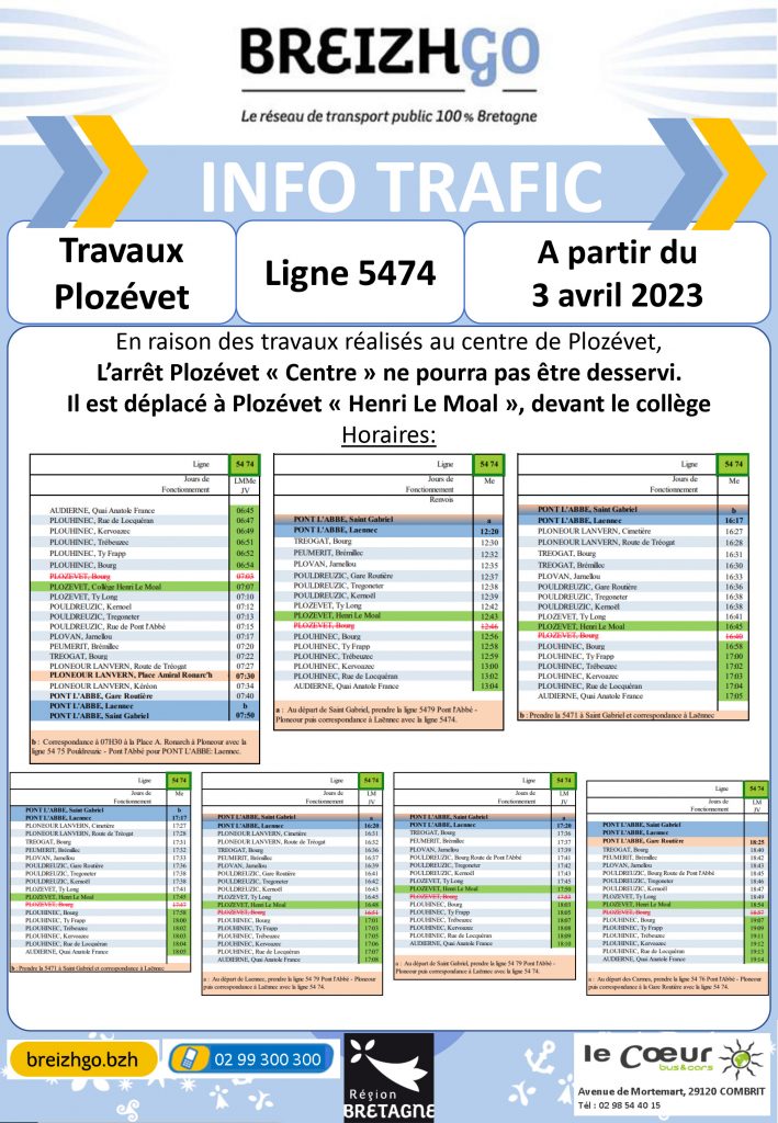 Chers usagers, nous ne desservirons pas « Centre » (Ligne 5474) à Plozévet à partir du 3 avril en raison de travaux. Nous vous demandons de vous reporter à l’arrêt « Henri Moal », devant le collège, merci de votre compréhension.