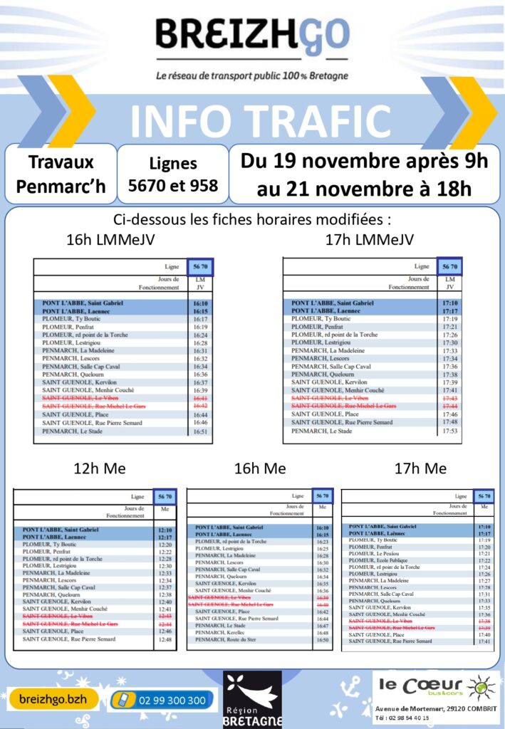 Chers usagers des lignes 958, 5630, 5631 et 5670, du 19 novembre à partir de 9h jusqu’au 21 novembre à 18h, en raison des travaux « Rue Michel Le Gars » à Penmarc’h et de la difficulté pour nos cars de circuler en toute sécurité :