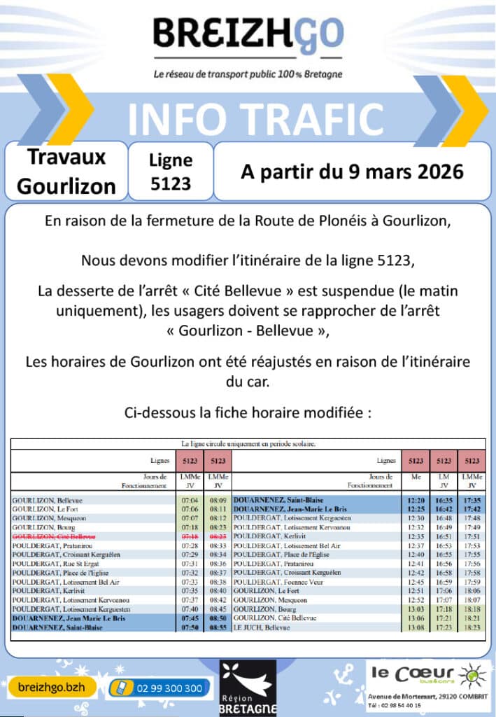 En raison de la fermeture de la Route de Plonéis à Gourlizon, nous devons modifier l’itinéraire de la ligne 5123. La desserte de l’arrêt « Cité Bellevue » est suspendue (le matin uniquement), les usagers doivent se rapprocher de l’arrêt « Gourlizon – Bellevue ».